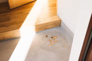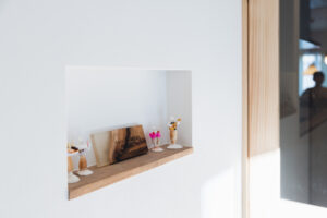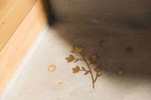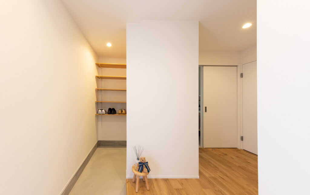 まず目を引くのは、モルタルで仕上げたダイナミックな玄関ポーチ。広々としたテラスのような空間が、住まいの顔として安心感とモダンな印象を与えています。 玄関ホールには、床に埋め込まれた真鍮のアクセントや、空間に彩りを添えるニッチを配置。一歩足を踏み入れた瞬間から、この家ならではの個性を感じていただけます。