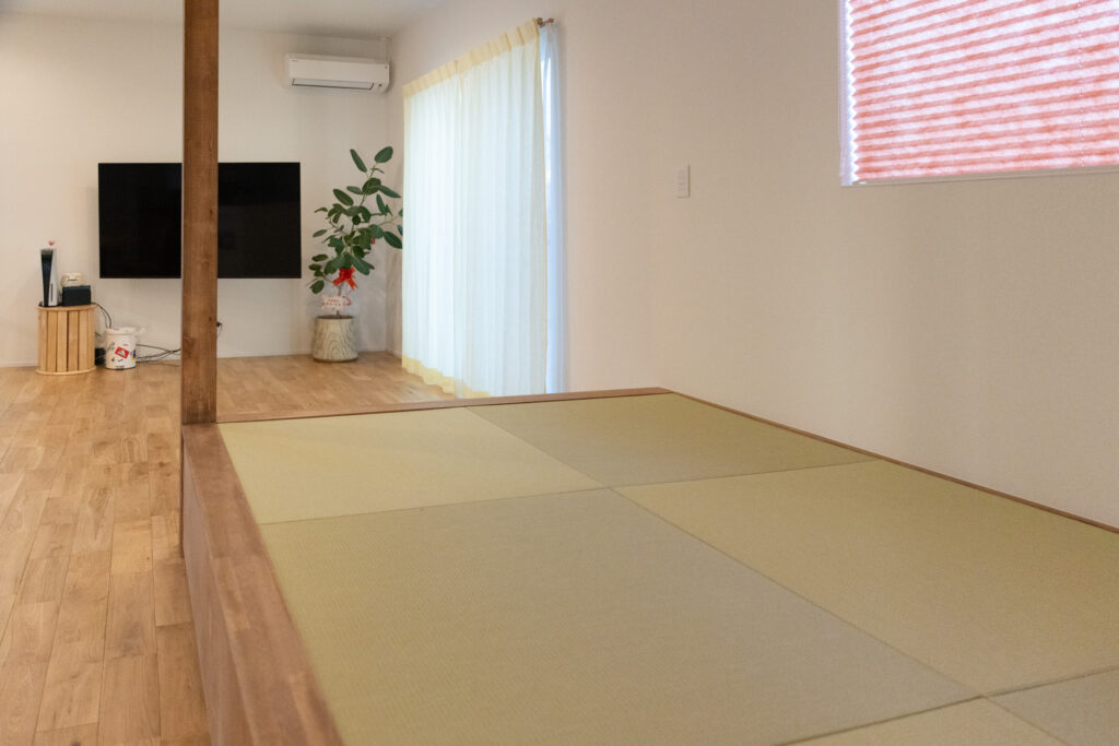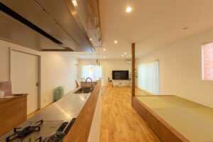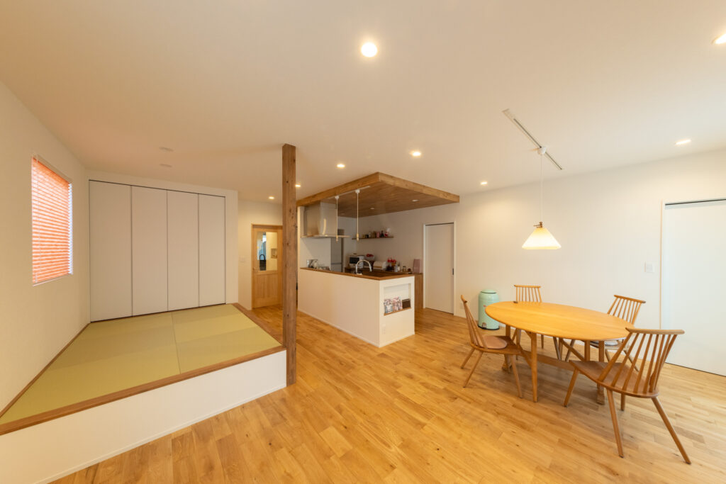 日々の暮らしの中心となるLDKは、光がたっぷりと降り注ぐ開放感あふれる空間に。隣接する畳コーナーは、家族が自然と集まり、思い思いに寛げる場所となりました。